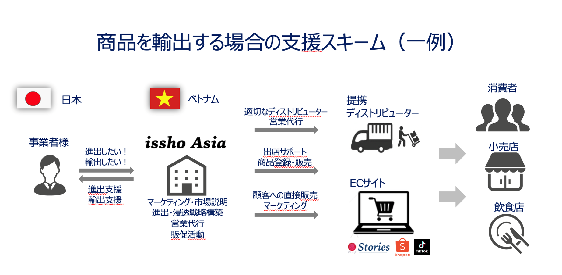 現在は、ISSHO ASIA CO., LTD.を通じて、ベトナム進出支援、駐在員事務所代行、商品の売れる化、販路開拓、マーケティング支援などを行っています。近年は、現地法人設立前の情報収集や市場調査、商談代行、現地運営サポートなど、駐在員事務所の役割を代行するご相談も増えています。